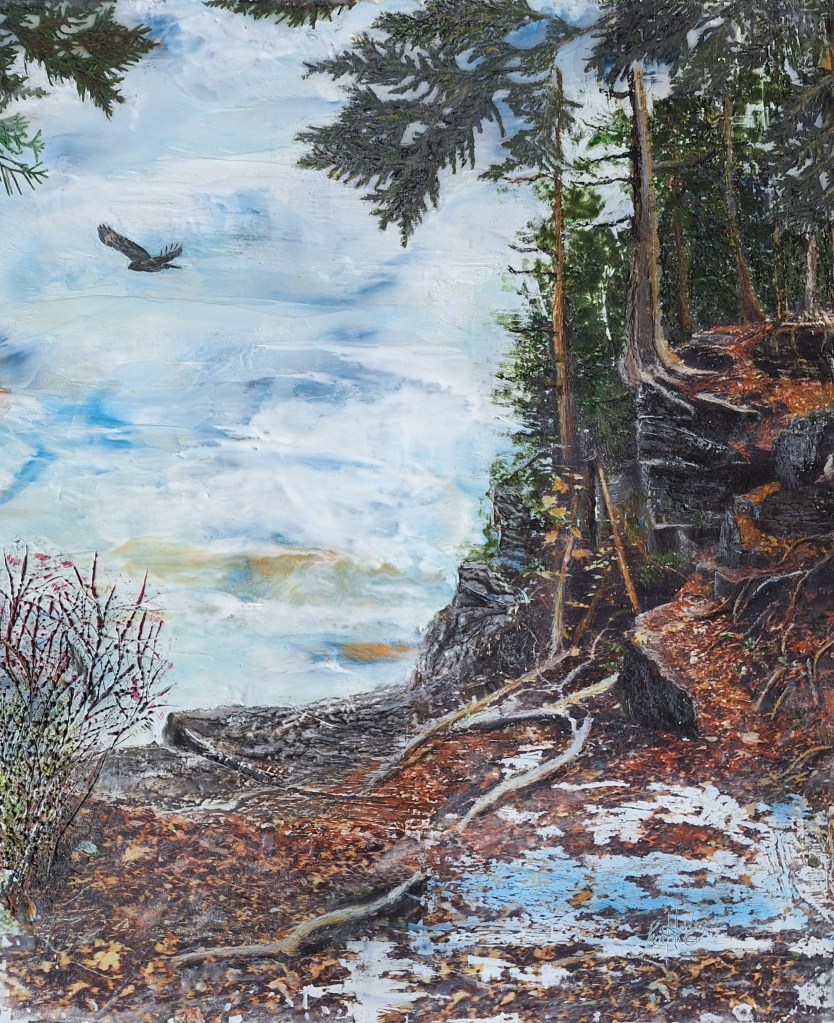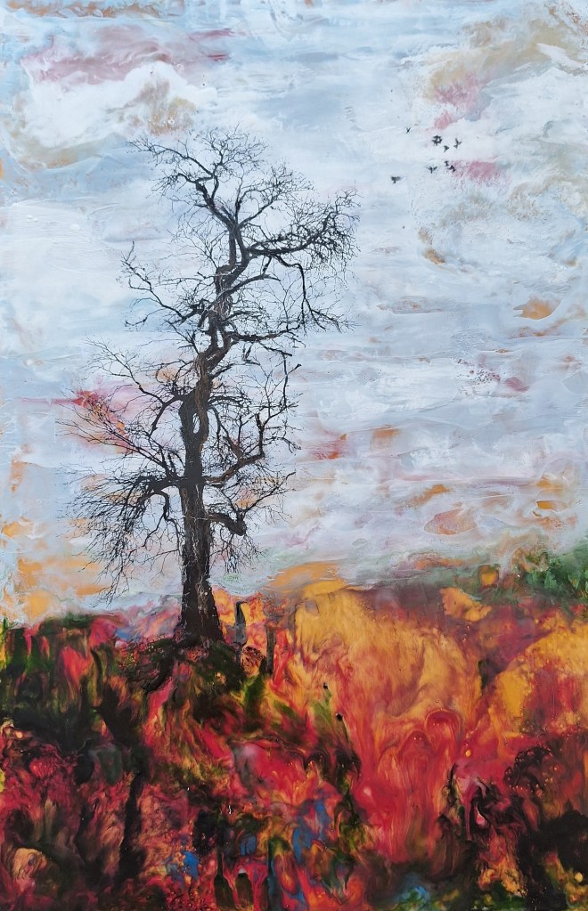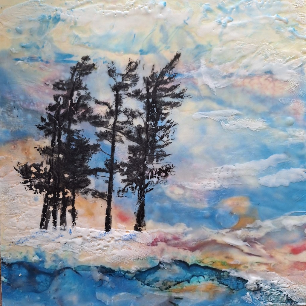 Encaustic paintings are made of a combination of oil paints, tree resin, bees wax with some mixed media incorporated and created on birch board.